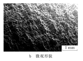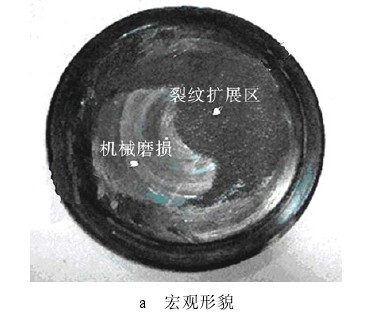 2.1.1 軸斷裂面宏觀及微觀形貌觀察 軸斷裂面處于軸上軸承安裝處的過(guò)渡圓弧區(qū)域(軸承安裝根部)。圖 1 為斷軸宏觀斷裂面,局部發(fā)生磨損,斷口表面齊整與軸向垂直,無(wú)縮頸和塑性變形痕徑。斷口疲勞條帶明顯,從外圓向中心擴(kuò)展,最終瞬斷區(qū)面積小于軸截面積的 10%,說(shuō)明斷軸所受名義應(yīng)力較小。
