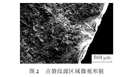 通過(guò)電鏡掃描微觀觀察,斷裂源起源于軸頸堆焊層表面,呈多源分布特征,有點(diǎn)裂紋源和線性裂紋源2.1.2 電機(jī)軸材質(zhì)分析 對(duì)基體進(jìn)行光譜元素測(cè)量,分析結(jié)果示于表 1。分析結(jié)果表明,軸材質(zhì)元素成分分布均勻,無(wú)其他缺陷,僅含有少量硫化物、氧化物等冶金缺陷,屬于中碳鋼,對(duì)應(yīng)我國(guó) 45#鋼,是電機(jī)軸常用推薦材料,分析認(rèn)為軸材質(zhì)合格,并未對(duì)軸斷裂造成影響。