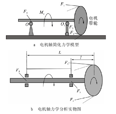 2.2 電機(jī)軸力學(xué)計(jì)算分析由于電機(jī)軸為階梯軸,不同階梯截面處承受的力矩和應(yīng)力是不同的。電機(jī)運(yùn)行時(shí)軸受到彎扭力矩的共同作用,如果某一階梯截面承受應(yīng)力過(guò)大,則可能最先在階梯截面過(guò)渡圓弧處萌發(fā)裂紋和發(fā)生斷裂,因此找出電機(jī)軸受力危險(xiǎn)截面,對(duì)判斷軸斷裂原因有重要作用。電機(jī)軸力學(xué)分析簡(jiǎn)化模型如圖 4 所示。圖中,F(xiàn)1、F2為皮帶張緊力;F3、F4為電機(jī)軸支撐力;Me為電機(jī)轉(zhuǎn)矩;O 與O1為電機(jī)軸支撐點(diǎn);F 為皮帶張緊力 F1與 F2的合力;T 為 O1支撐點(diǎn)承受的彎矩;D 為電機(jī)軸分析截面直徑;M 為分析截面對(duì)應(yīng)扭矩;L 和 l 分別為電機(jī)左端軸承距右端軸承及電機(jī)帶輪的水平距離。