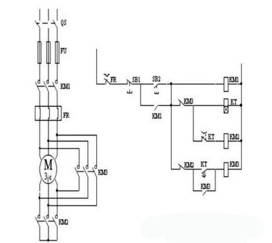 圖中主回路采用兩個接觸器,即正轉(zhuǎn)接觸器KM1和反轉(zhuǎn)接觸器KM2。當(dāng)接觸器KM1的三對主觸頭接通時,三相電源的相序按U―V―W接入電動機。當(dāng)接觸器KM1的三對主觸頭斷開,接觸器KM2的三對主觸頭接通時,三相電源的相序按W―V―U接入電動機,電動機就向相反方向轉(zhuǎn)動。電路要求接觸器KM1和接觸器KM2不能同時接通電源,否則它們的主觸頭將同時閉合,造成U、W兩相電源短路。為此在KM1和KM2線圈各自支路中相互串聯(lián)對方的一對輔助常閉觸頭,以保證接觸器KM1和KM2不會同時接通電源,KM1和KM2的這兩對輔助常閉觸頭在線路中所起的作用稱為聯(lián)鎖或互鎖作用,這兩對輔助常閉觸頭就叫聯(lián)鎖或互鎖觸頭。
