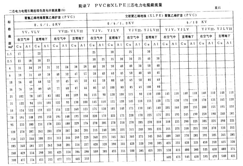 說(shuō)明:三芯電力電纜1~10KV XLPE和PVC電力電纜線芯允許長(zhǎng)期最高工作溫度分別為90℃和70℃。XLPE電纜短時(shí)過(guò)載溫度不超過(guò)130℃,短路溫度不超過(guò)250℃,持續(xù)最長(zhǎng)時(shí)間不超過(guò)5S。PVC電纜短路溫度不超過(guò)150℃,持續(xù)最長(zhǎng)時(shí)間不超過(guò)5S,電纜敷設(shè)溫度應(yīng)不低于0℃。三芯電纜彎曲半徑≥10D,連續(xù)負(fù)荷允許載流量數(shù)據(jù)是在以下運(yùn)行方式下測(cè)量所得: