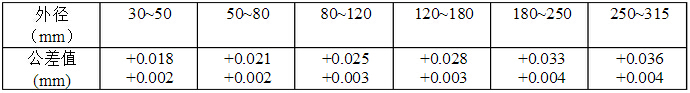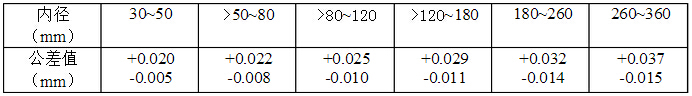 軸承與軸承室配合,其軸承套內(nèi)徑選擇公差見表二。在加工中應(yīng)盡量控制在中間公差的上偏差區(qū)間內(nèi),呈間隙配合,以保證電機(jī)在額定運(yùn)行中其軸貫通部分發(fā)熱時(shí),為熱膨脹留有一定裕度。但是軸承套加工尺寸不宜過大,否則會(huì)發(fā)生跑套現(xiàn)象,軸承更容易發(fā)熱,為此在檢修中,應(yīng)嚴(yán)格把住軸承內(nèi)、外徑實(shí)際配合精度,以保證軸承裝配后達(dá)到有限自由的穩(wěn)定運(yùn)行狀態(tài)。