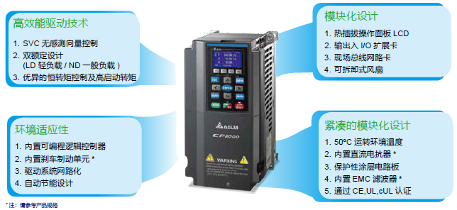 CP2000系列為無(wú)感矢量控制變頻器,延續(xù)臺(tái)達(dá)設(shè)計(jì)團(tuán)隊(duì)對(duì)節(jié)能省電理念的一貫性,針對(duì)風(fēng)機(jī)、水泵、HVAC Drive相關(guān)應(yīng)用特制化、PID智能調(diào)適和優(yōu)異設(shè)計(jì)的產(chǎn)業(yè)效能所推出的變頻器。其無(wú)感矢量控制(SVC)的智能表現(xiàn),適時(shí)提升負(fù)載轉(zhuǎn)矩響應(yīng),滿足客戶寬廣的變轉(zhuǎn)矩負(fù)載需求,提升馬達(dá)在一般用途的效能。3段式V/F冪級(jí)曲線響應(yīng),能在變動(dòng)轉(zhuǎn)矩負(fù)載的環(huán)境下,適時(shí)的調(diào)整輸入電壓來(lái)提高整體效能,特別是水泵,風(fēng)機(jī)負(fù)載之類的應(yīng)用。FLYING START、自動(dòng)加減速功能、瞬時(shí)停電再啟動(dòng),馬達(dá)參數(shù)AUTO-TUNING等功能,對(duì)變轉(zhuǎn)矩負(fù)載的環(huán)境操作及保護(hù),提供適當(dāng)?shù)倪\(yùn)行及節(jié)能方桉。?