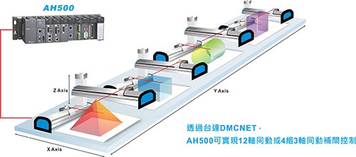 AH500的優(yōu)異運(yùn)動(dòng)控制功能,可實(shí)現(xiàn)任意三軸直線補(bǔ)間、任意兩軸圓弧補(bǔ)間、及任意三軸螺旋補(bǔ)間與連續(xù)補(bǔ)間功能,透過(guò)臺(tái)達(dá)DMCNET高速通訊網(wǎng)絡(luò)架構(gòu),可達(dá)到1ms的指令周期內(nèi)12軸同動(dòng)或4組3軸同動(dòng)補(bǔ)間功能。無(wú)論是復(fù)雜的過(guò)程控制或是精密的運(yùn)動(dòng)控制需求,都能透過(guò)AH500來(lái)實(shí)現(xiàn),有效應(yīng)用于各種產(chǎn)業(yè)機(jī)臺(tái),如建材機(jī),經(jīng)編機(jī),食品包裝機(jī)等等。